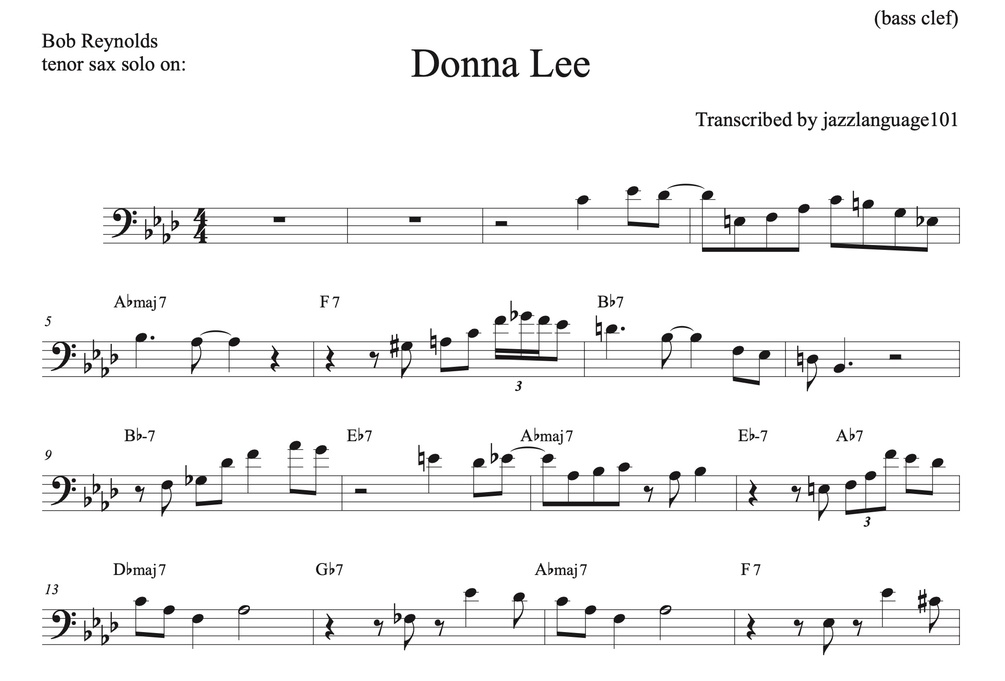 Bob Reynolds solo transcription on 'Donna Lee' (bass clef)
